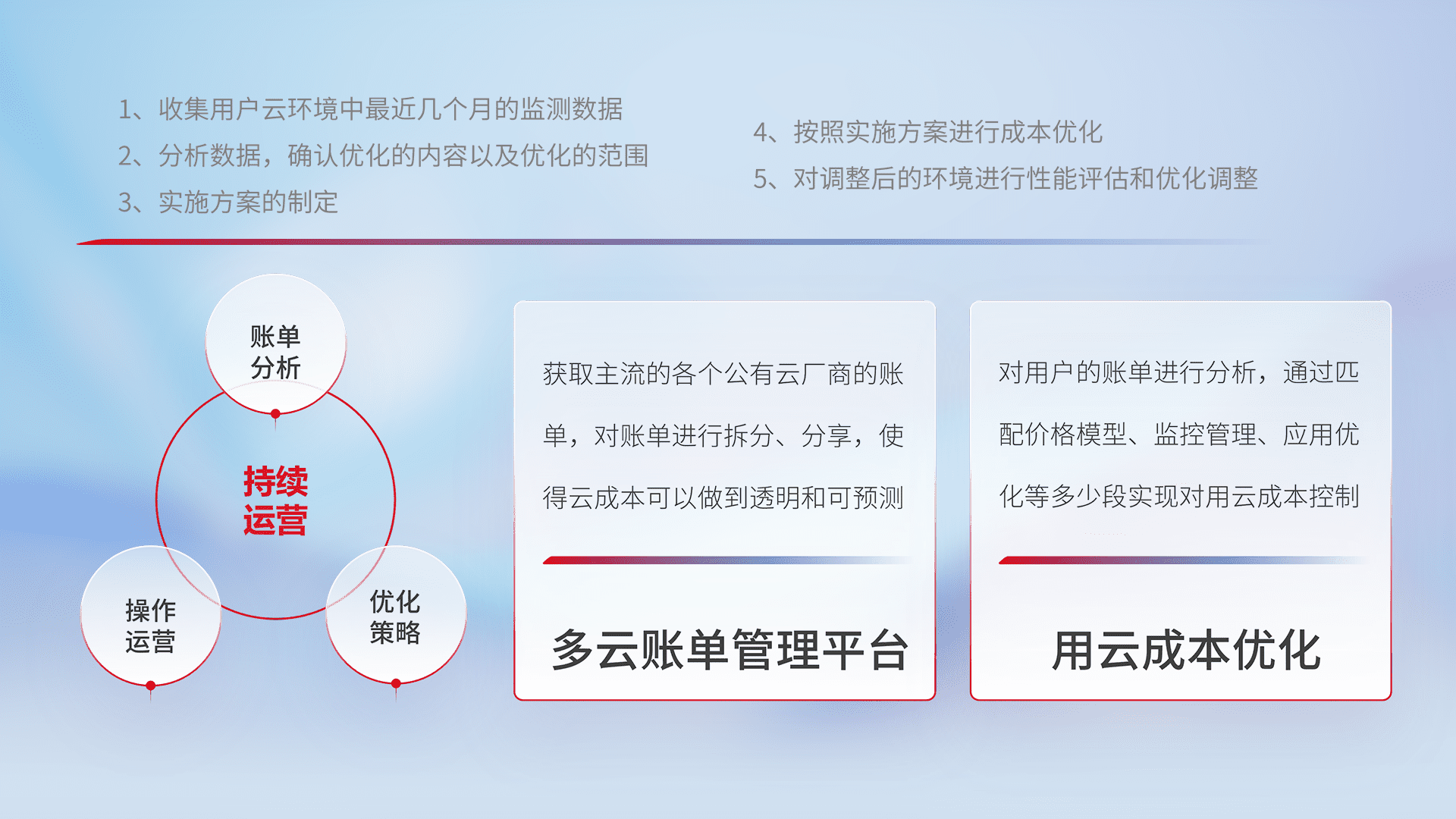 通过多云纳管,,以统一的资源数据模型把客户的云资源进行抽象和封装,,进而实现对多云资源的统一操作,,,保障云资源管理的可靠性、、、、稳定性与可用性。。。量身定制化运维内容,,,配置、、、、开发运维、、补丁管理、、、备份、、、监控、、、认证和访问管理、、审计和日常巡检等,,,,保障在用云过程中的可靠度,,,,稳定度以及高可用率。。。。